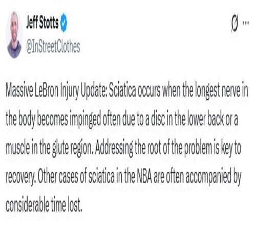 另一医学专家Jeff Stotts表示,勒布朗伤情重大更新:坐骨神经痛的发生是由于人体最长的神经受到压迫所致,压迫通常源于腰椎间盘或臀部肌肉问题。解决问题的根源是康复的关键。NBA中其他坐骨神经痛病例往往伴随着长期休战;NBA名宿纳什曾遭遇过这样的伤病。