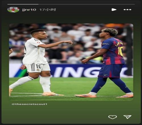 在2025/26赛季首轮西班牙国家德比战后,曼联新星JJ-加布里埃尔通过社交媒体转发了一则贴文,贴文内容为:好一张充满张力的画面!姆巴佩在进球后,向亚马尔宣告 “这里是我的主场”。