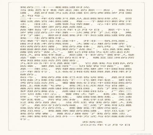 镜头一:2025年12月9日,田径男子100米亚洲纪录保持者、中国短跑名将苏炳添宣布退役。他在自己的社交媒体上发文,回顾了自己21年田径生涯的心路历程。