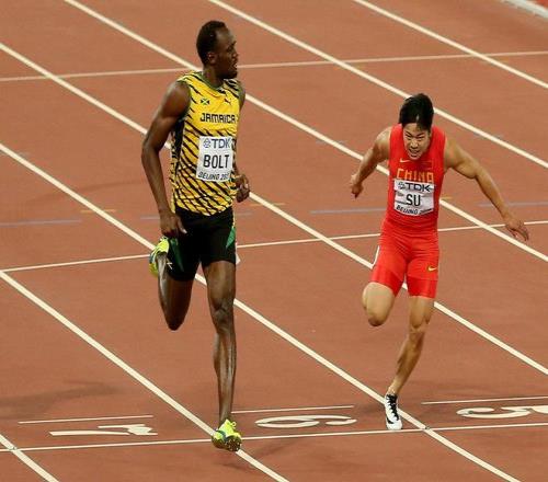 2015年8月23日,苏炳添与博尔特同组较量。视觉中国 图