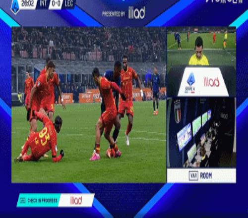 第27分钟,博尼禁区内倒地,裁判经VAR后没有判罚点球
