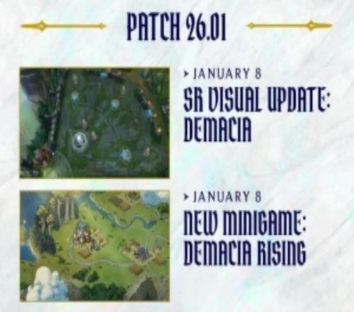 体育资讯1月9日称 LOL发布德玛西亚赛季版本规划(具体上线内容请以正式服为准),具体如下: 26.01版本: 全新版本上线 “德玛西亚的崛起”小游戏上线